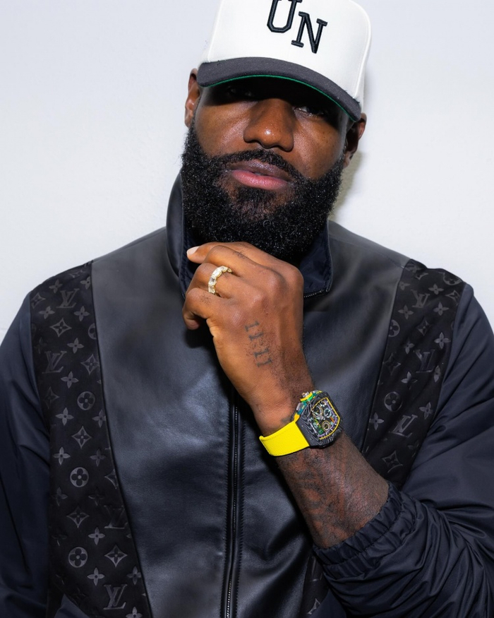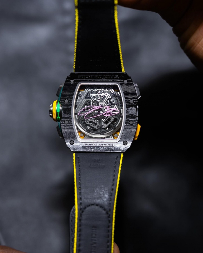 这款腕表是理查米尔为詹姆斯打造的限量150枚的RM65-01腕表,而詹姆斯本人则晒出了限量150枚中编号为1的那一枚。腕表表面12点位置有他的皇冠Logo,背透的后表壳则有他的签名。j类似詹姆斯这款钛金属材质普通版本的65-01售价大约在38万美元。