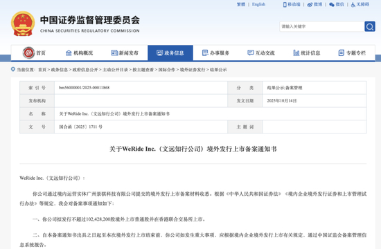 10月14日,中国证监会发布关于WeRide Inc.(文远知行公司)境外发行上市备案通知书。根据备案通知书,文远知行拟发行不超过102428200股境外上市普通股并在香港联合交易所上市。