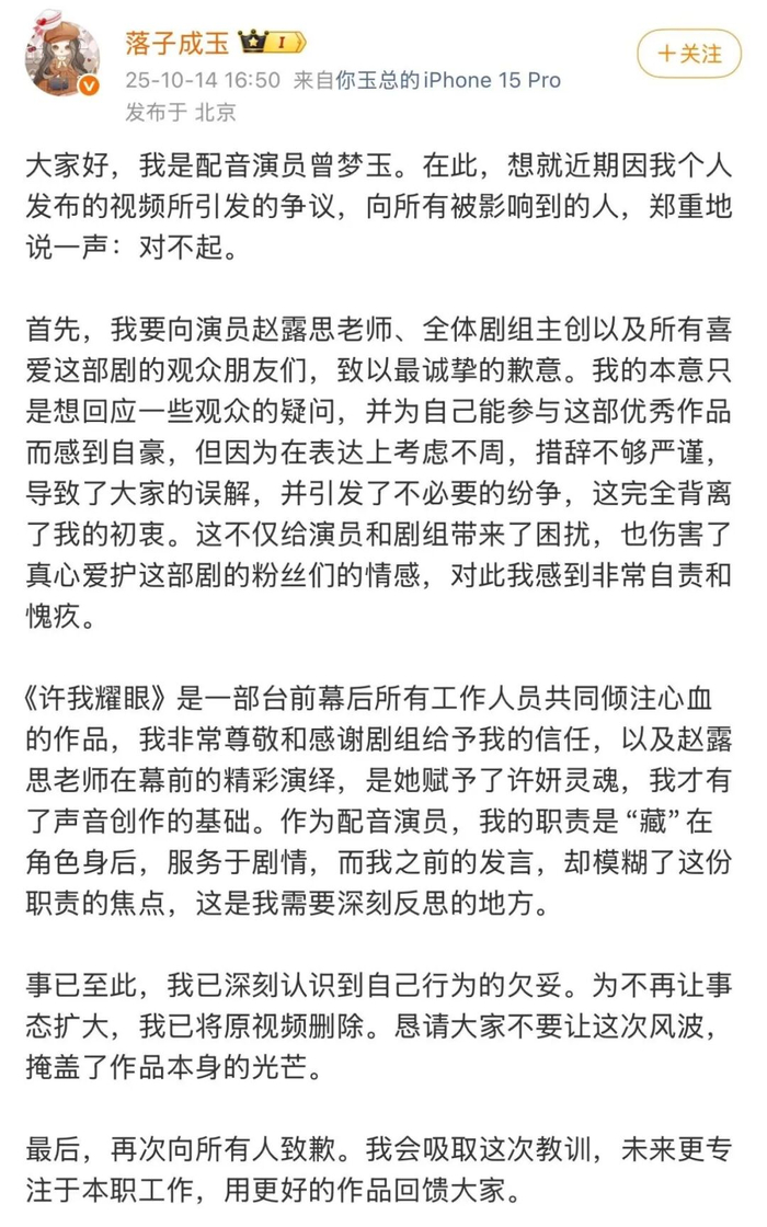 10月14日,《许我耀眼》配音演员“落子成玉”发文致歉,称向演员赵露思老师、全体剧组主创以及所有喜爱这部剧的观众朋友们,致以最诚挚的歉意。表示本意只是想回应一些观众的疑问,并为自己能参与这部优秀作品而感到自豪,但因为在表达上考虑不周,措辞不够严谨,导致了大家的误解。