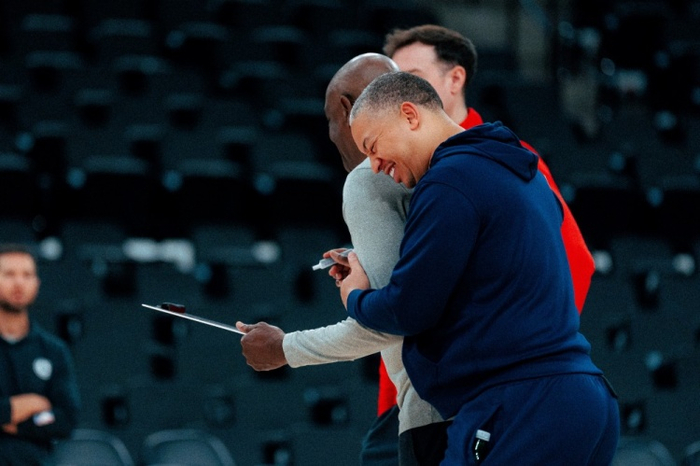 直播吧10月15日讯 快船官推发布今天训练照,全员都面带笑容,氛围非常好。