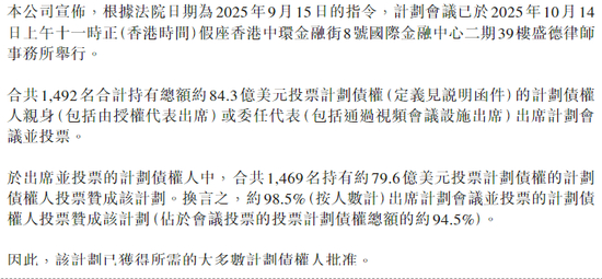 10月14日,融创中国公告说,当日公司举行的境外债重组计划会议结果出炉,共有1492名债权人投票,其中1469名债权人投下赞成票,占比达98.5%,对应债务金额支持率高达94.5%。