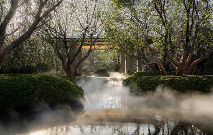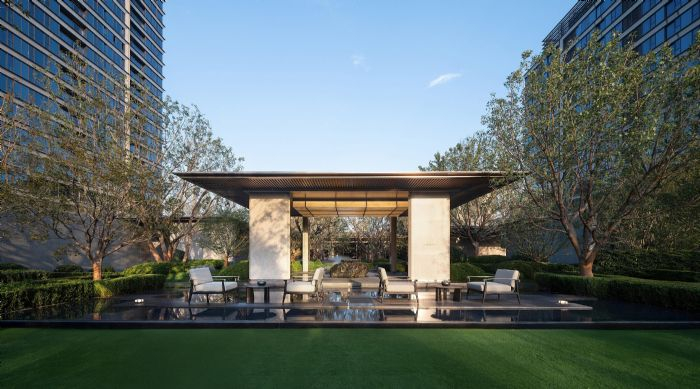 同样初次呈现的,还有在近百米的南北楼间内打造的景观园林核心区。据现场人员介绍,融创壹号院的园林以“新都市自然主义”为理念,国际、都会与自然的格调贯穿始终,强化空间对称的序列感与几何美学的艺术性。自住区大堂进入,即见大片镜面水景、廊亭和草坪构成的景观核心轴。两侧错落的廊道之间,由多层次植被组合与微地形营造,可赏、可游、可栖,也带来了尊贵、隐逸的独特感官体验。