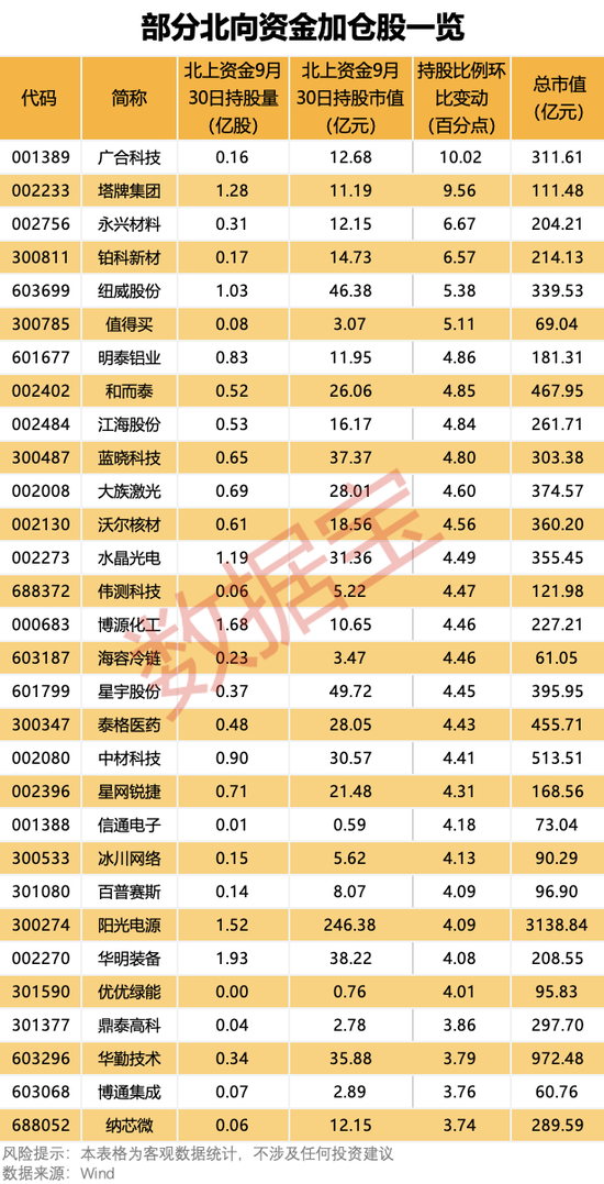 从成份股来看,按照持股数量占流通A股比例计算,北向资金最新持股环比加仓个股超过1700只,其中103股持股比例增加均超过2个百分点,获得北向资金大比例加仓。