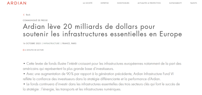 此次成功募资进一步巩固了 Ardian 在关键基础设施领域的国际领导地位。凭借其独特的投资方法和卓越的投资往绩,Ardian 提供了市场上最稳定、最具持续性的投资平台之一。该基金将延续 Ardian 二十年来的发展策略,结合产业化运营模式与投资专业能力,专注于三大核心领域——能源、交通运输和数字基础设施。这些领域正在驱动未来发展,并持续增强欧洲的竞争力。