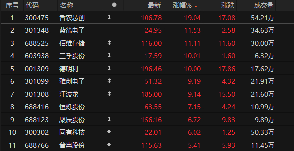 10月16日,存储芯片板块持续走强,香农芯创(300475)盘中触及20%涨停再创新高,截至午间休市,云汉芯城、德明利等股封板,佰维存储、江波龙等股纷纷大涨。