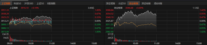 10月16日,A股三大指数早盘集体上涨,截至午盘,上证指数涨0.1%,深成指涨0.15%,创业板指涨0.69%,北证50跌1.16%。沪深北三市半日成交12229亿元,较上日缩量576亿元。