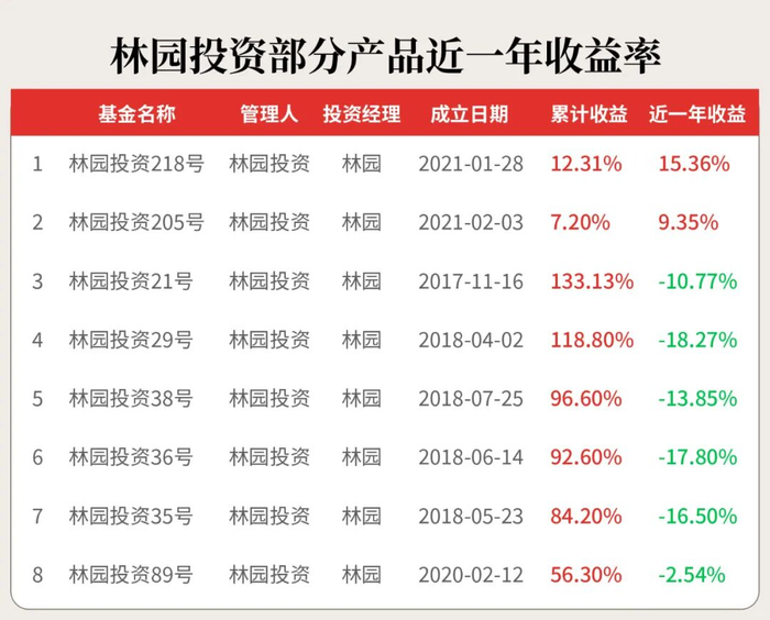 根据私募排排网数据,林园旗下18只有业绩披露的产品今年均跑输沪深300指数。即便收益表现较好的“林园投资218号”,近一年15.36%的收益,仍低于沪深300同期18.77%的涨幅。而例如“林园投资21号”等产品,年内更是出现了小幅亏损。