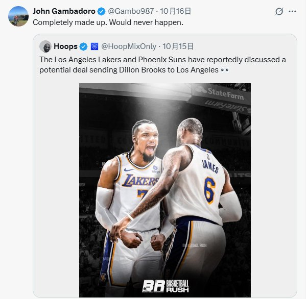 但太阳队记John Gambadoro转发了该推文进行辟谣:“纯属虚构,绝不可能发生。”