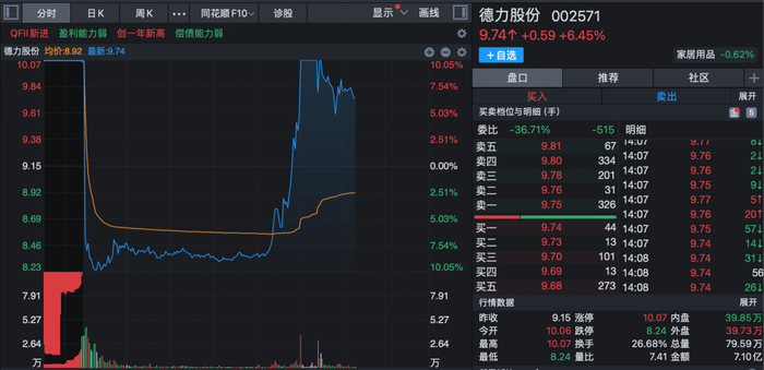 热门股方面,德力股份(002571)午后突然直线拉升,走出“天地天”行情,成交额超7亿元,换手率超过26%。该股前一天涨停。