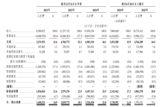 但在国内市场,东鹏饮料业绩快速增长。招股书显示,2022年至2024年,东鹏饮料营业收入分别为85.05亿元、112.57亿元、158.3亿元,年复合增长率为36.5%,净利润分别为14.41亿元、20.4亿元、33.26亿元,年复合增长率达52.0%。而今年上半年,公司实现营业收入107.32亿元,同比增长36.37%,净利润为23.75亿元,同比增长37.22%,业绩保持增长态势。