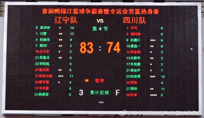 在丹东进行的全运会热身赛辽宁男篮对四川男篮的比赛刚刚结束,辽宁男篮以83:74战胜对手。