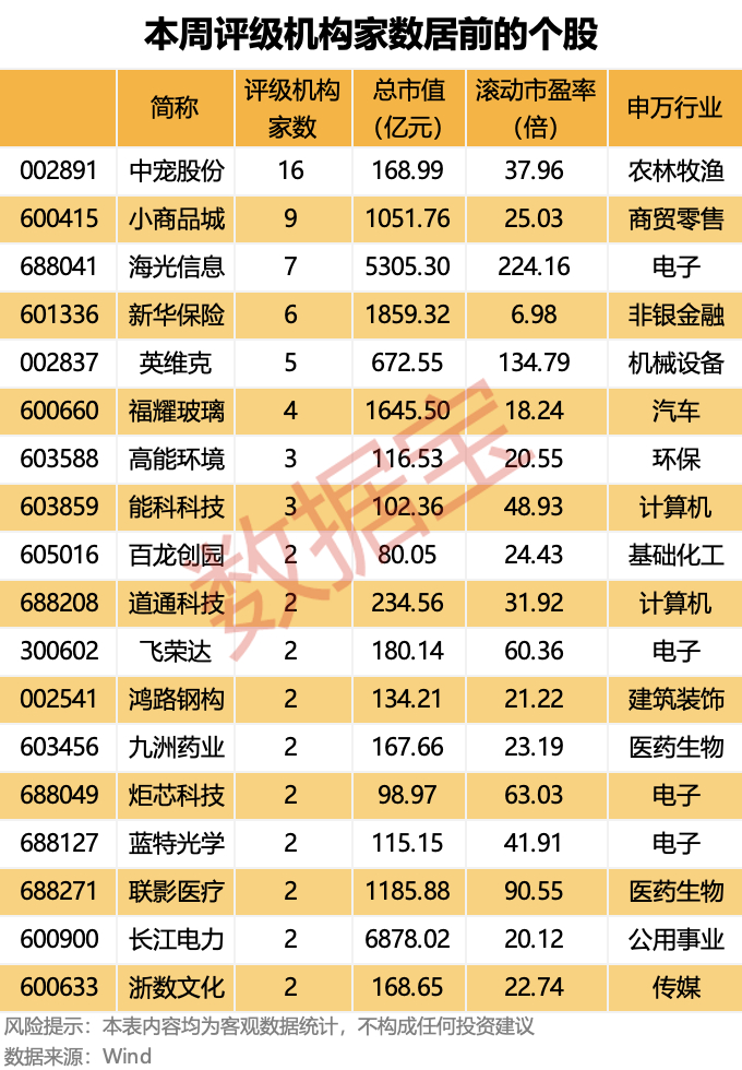 本周有8股获得3家及以上机构评级,中宠股份和小商品城评级机构家数居前,分别有16家和9家。