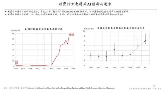 国外大模型应用普及加速案例看,从 2024 年 10 月到 2025 年一年时间里,据不完全统计,通过以个人用户为主的某一海外API 调用的大模型相关 token 量,从至少 0.2 万亿/周增至接近 6 万亿/周,实现了 30 倍的增长,而国内大模型日均 Tokens调用案例看,其调用量(含企业用户)已突破了30万亿/日。可能越来越多人在应用它,它也在帮助人们做越来越多复杂的事情。现在有很多讨论,比如公域数据,私域数据安全问题,机器无孔不入,但也不知道机器是在学习还是捏造,应该谁来做审计呢?大模型也应用在美国的对冲基金行业,这里有一些他们自己报告,经济学家们统计的渗透率及对回报提高的数据。
