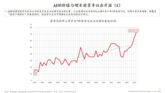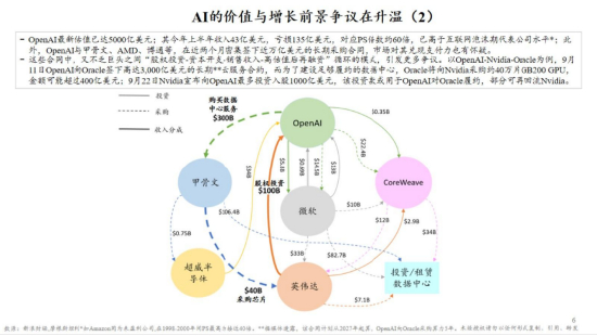 现在,我们面临新的革命和技术创新带来的格局改变,AI应用领域广泛,也成为市场追捧的投资对象,AI公司自身投资的资金占其运营现金流比重不断提高,下一张图从另一方面看这种投资的模式也出现圈内循环等新模式,AI相关公司的系统性资本开支都在迅速增加。OpenAI说花了3千亿买甲骨文的服务,甲骨文花了400亿买英伟达的芯片,英伟达又对OpenAI至多会投1千亿,这让我们金融市场的人都有些晕眩了。