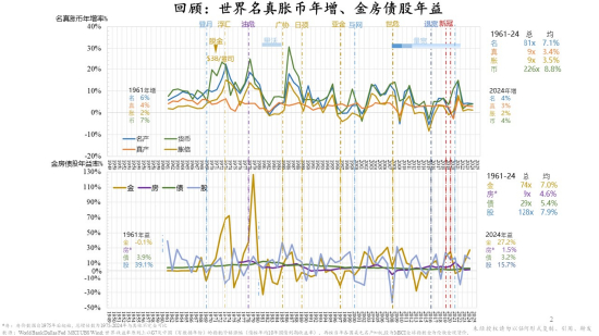 我们观察到经济里有这样的现象,以1971年美元与黄金脱钩为例,下方列出伦敦黄金价格、以及房产、债券、股票的一些代表性国家加权而成了对应资产的世界指数。首先一个明显特征是黄线代表的通胀与下图中的黄金,60多年里有十几个周期几乎都是非常明显的对应关系,最大的一次是美国脱钩后引起的,现在又开始比较大。货币发行对经济刺激周期产生影响,最终转移到价格变化形成通胀,进而引发黄金的反应。再看房产,从图中的世界房产指数,发现它变化幅度不大,总体有点偏正;债务幅度很小,初始值4%,最后3%;股票波动永远很大,高风险高收益,承担必要风险是社会获得回报收益很重要的源泉。