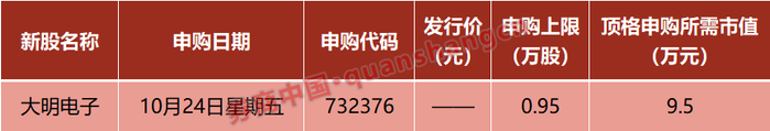 本周(10月20日—10月24日)有1只新股发行。周五:大明电子。