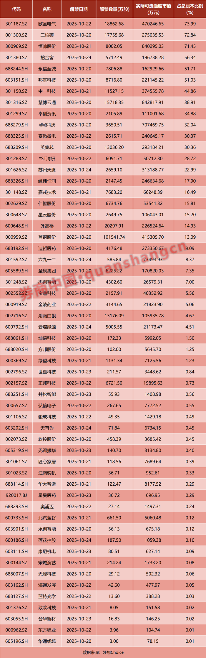 数据显示,本周(10月20日—10月24日)共有56家公司限售股陆续解禁,合计解禁31.51亿股,按最新收盘价计算,解禁总市值为704.41亿元。