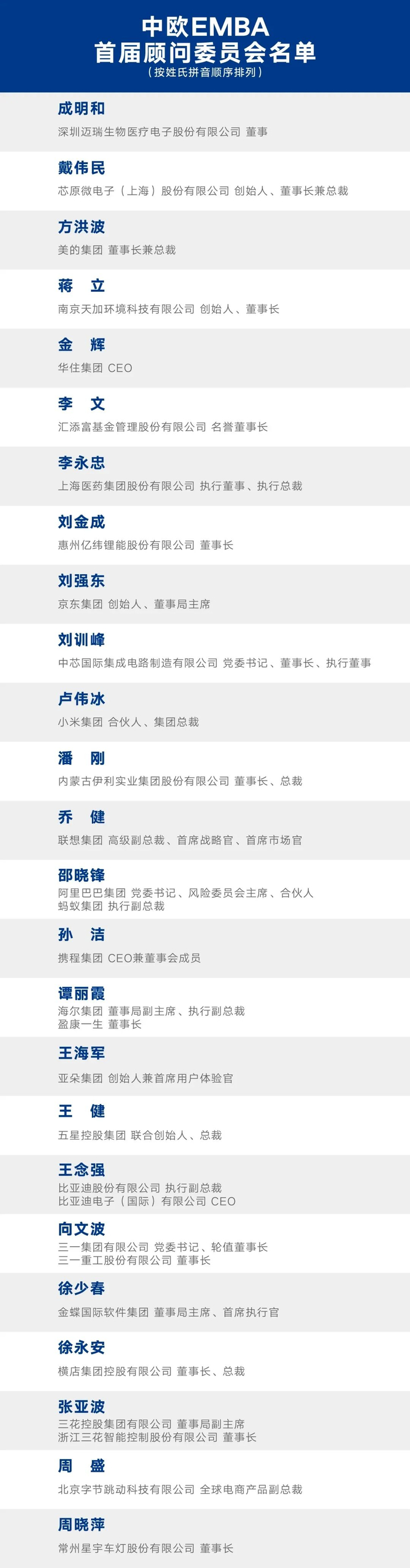 中欧EMBA首届顾问委员会的成立,既是中欧顺应时代需求、推动商学教育高质量发展的主动作为,也是链接学界与业界资源、实现产学研深度融合的重要探索。既为中欧以及EMBA课程的战略发展注入了新的思路,更为国际商学教育如何更好地赋能商业寻找新的答案。这不仅是中欧作为国际商学院的责任担当,也是中欧与所有合作伙伴共同推动商业文明进步的初心所在。