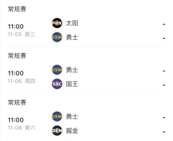 随后勇士11月2日征战客场(VS步行者)回来之后休息2天,再迎来一个4天3赛(主场打太阳、客场打国王、休息一天后客场打掘金)。