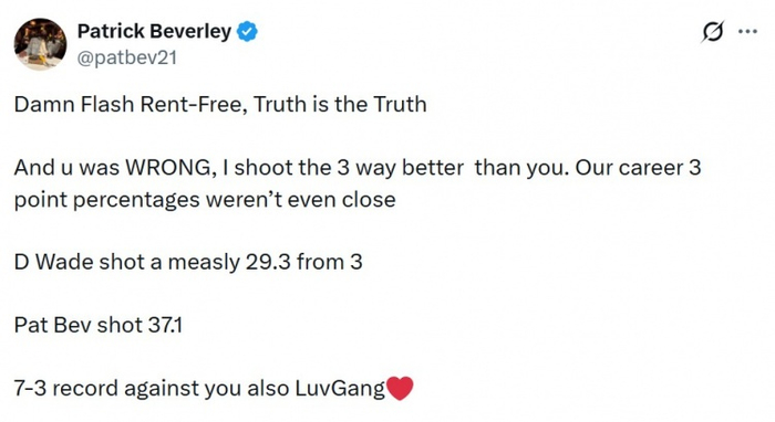 对此,贝弗利更推评论道:“事实就是事实,你错了。我的三分球投得比你好得多。我们的职业生涯三分球命中率相差甚远。德维恩·韦德的三分球命中率只有29.3% 帕特里克·贝弗利的三分球命中率是37.1%。我对阵你的战绩是7胜3负,爱你哦❤️。”